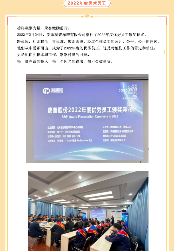 董事長對各部門、子公司負責人的2022年度總結及2023年度工作規(guī)劃進行分析,對大家疫情期間的工作予以肯定,并對其薄弱與不足之處提出改進意見。2023年公司將圍繞開拓新市場、項目管理制度、事業部智能化制造、員工工作能力、公司管理制度等方面進行提升。努力為員工提供更好的福利待遇,為客戶提供更優(yōu)質的服務,為實現瑞普成為全球橡塑零部件核心供應商的企業愿景而不懈努力!